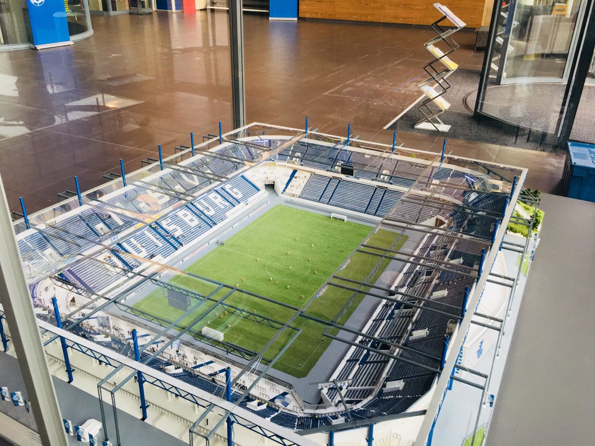 Seit dem 25.07.2018 befindet sich das Modell der MSV – Arena zwecks Dauerausstellung im Haupteingangsfoyer der echten MSV – Arena.