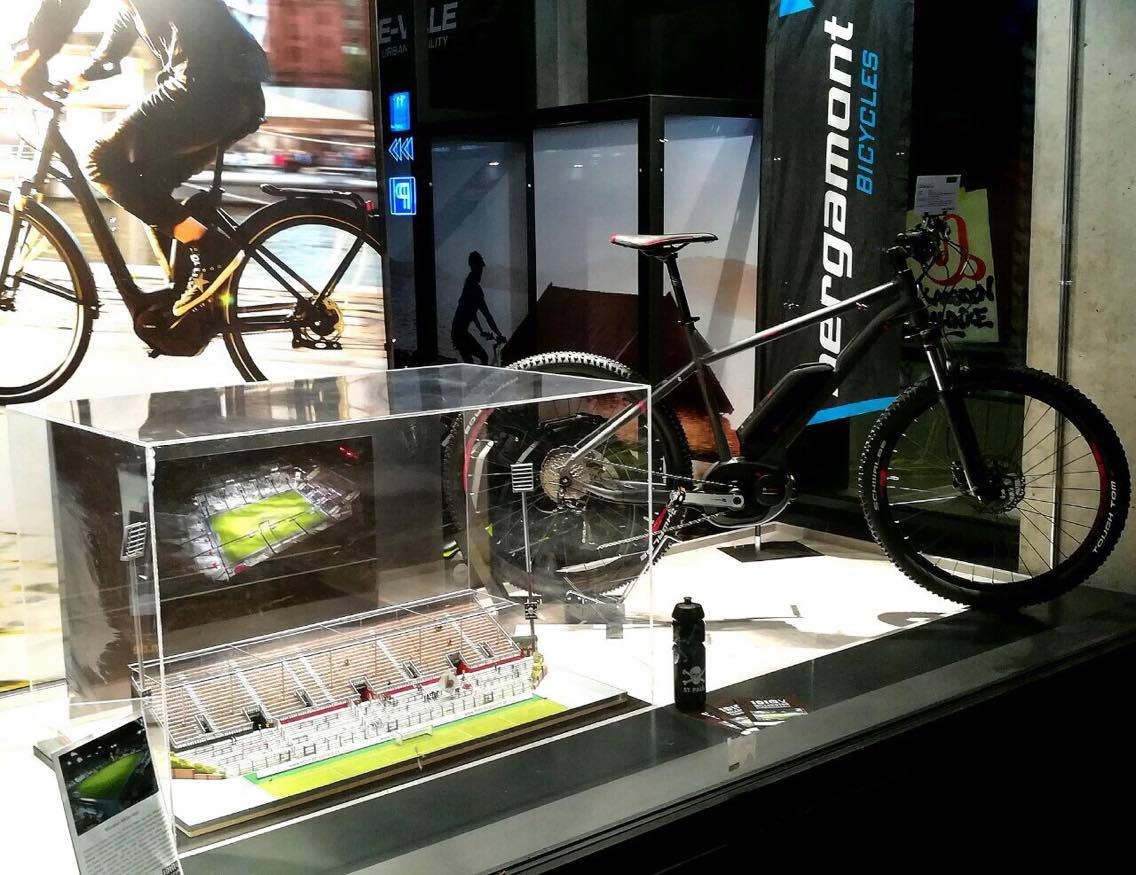 Die ,,ALTE NORDTRIBÜNE” befidet sich zur Zeit im Schaufenster der Firma Bergamont an der Budapester Strasse in Hamburg Sankt Pauli.